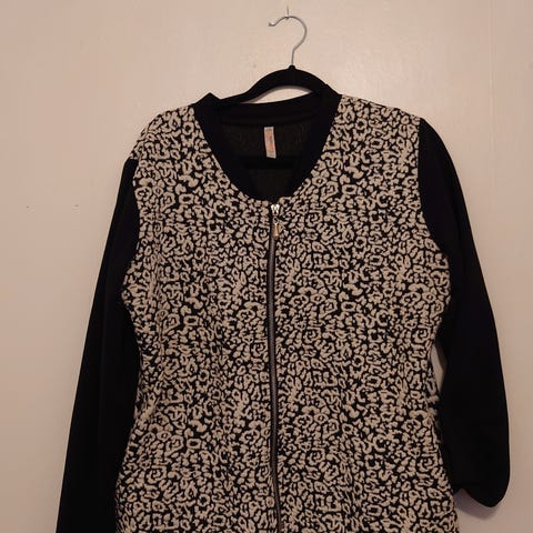 Stilig tynn bomberjakke med glidelås fra Jacqueline de YONG med mønster i fargene svart, beige, organsje, brun og rosa. Pent brukt. Kan brukes som dressjakke/blazer.