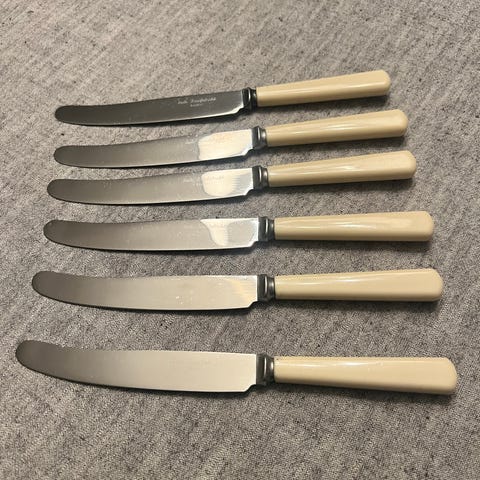 Veldig gammel kniv med sølvskaft. Denne må trygt kunne kalles velbrukt når man ser slitasjen på knivbladet, som per i dag fortsatt er skarpt og fint. Skaftet fortsatt nydelig , blankt og dekorativt.