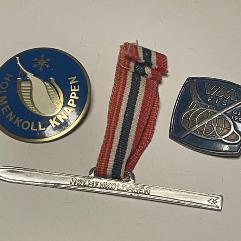 Liten plakett / skilt i fra det som skulle ha vært VM på ski i Holmenkollen i 1940. Det ble bare laget noen få forskjellige ting før dette VM som det ikke ble noe av pga krig og uroligheter rundt om i verden. 9 cm i diameter