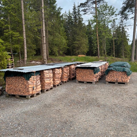 Ustablet fyringsklar blandingsved (hovedsak osp, gran og furu) selges for 1,10 per liter. (1100kr per 1000l).