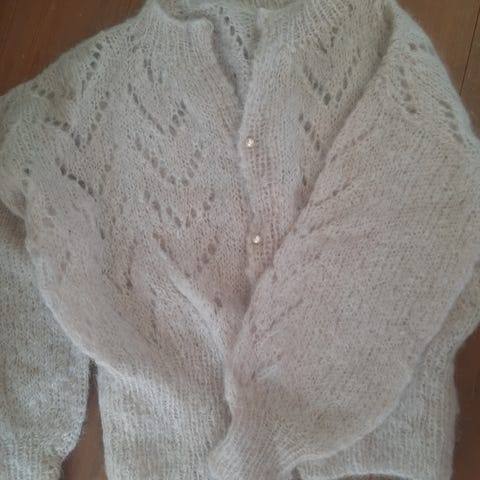 Hjemmestrikket flerfarget cardigan jakke med i-cordkant. Passer både S og M.