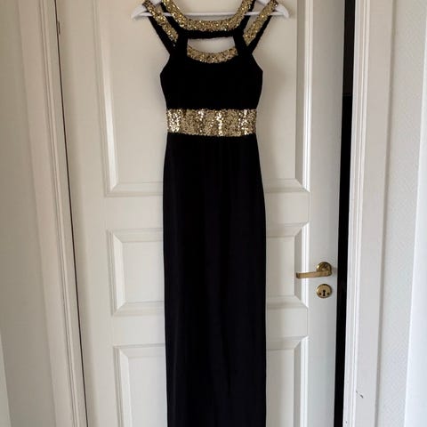 Fin, lang, sort kjole fra Riccovero selges 250,-Nydelige perlebroderi rundt halsen. Ny, ikke brukt.