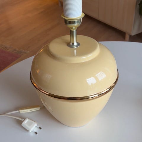 Lampene har plast skjermer. På den ene lampen er en plastremse røket, se foto med binders.