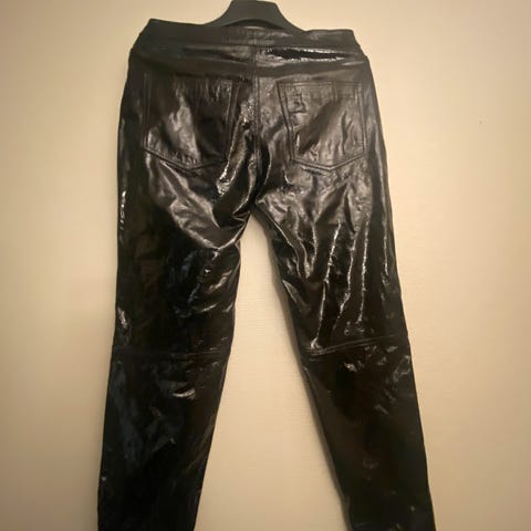 Gestuz bukser i lammeskinn i svart farge, størrelse M. Designet for kvinner. Bukser med fem lommer og knapp- og glidelåslukking. Ny