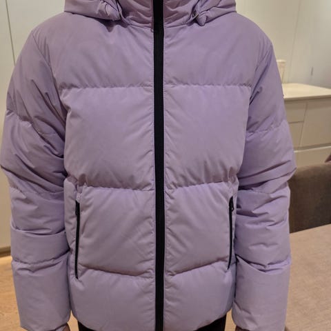 Lekker off-white vinter boblejakke med paljett detaljer på kragen. Noen sorte flekker på kragen, se bilde. Det er Benetton str. 130, men de er litt små i størrelsen så har "registrert" den som 122 på Finn.no.