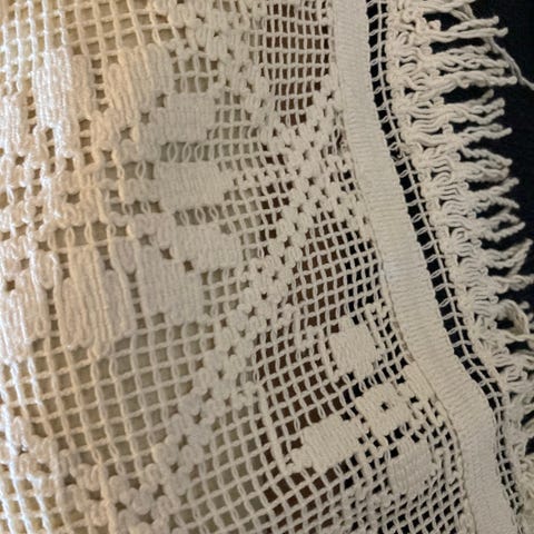 Pent, lite brukt heklet sengeteppe til salgs.