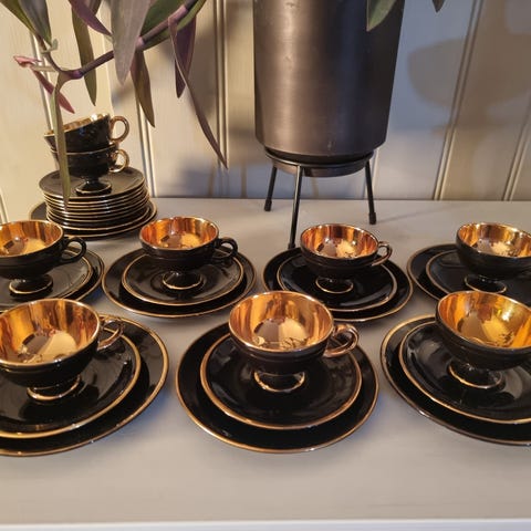 Moccaservise sort og gull (Egersund) Selges i deler