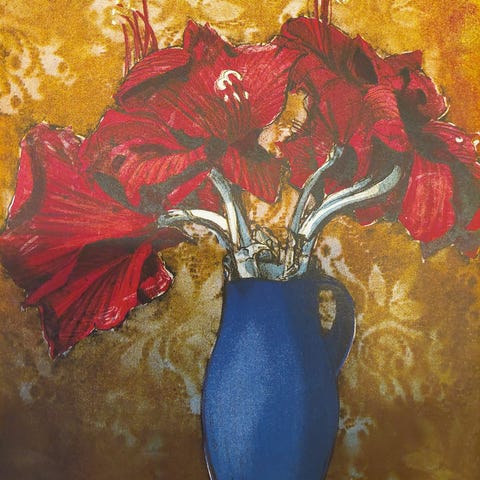 Litografien "Brun vase" (84/175) selges uten ramme. Prisen er fritt tilsendt. Litografien sendes i en papphylster.