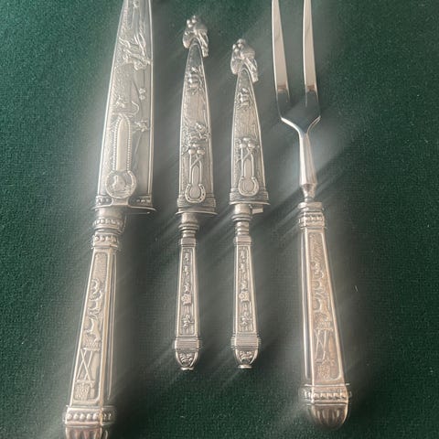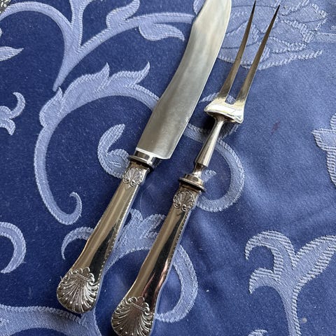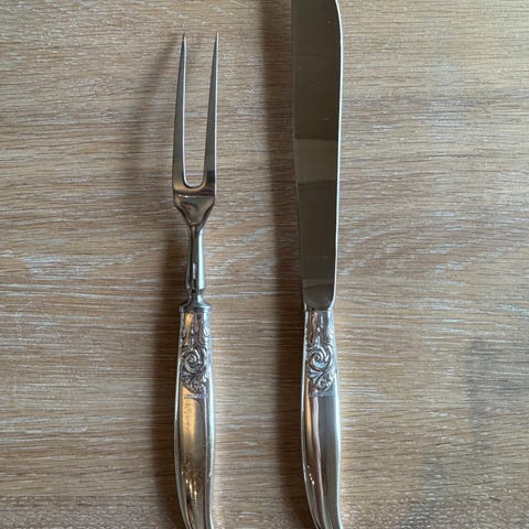 Jeg selger et sjeldent og flott forskjærssett eller tranchersett i sølvmønsteret Diplomat bestående av gaffel 24,5 cm og kniv 27,7 cm for kr 3.150,-.