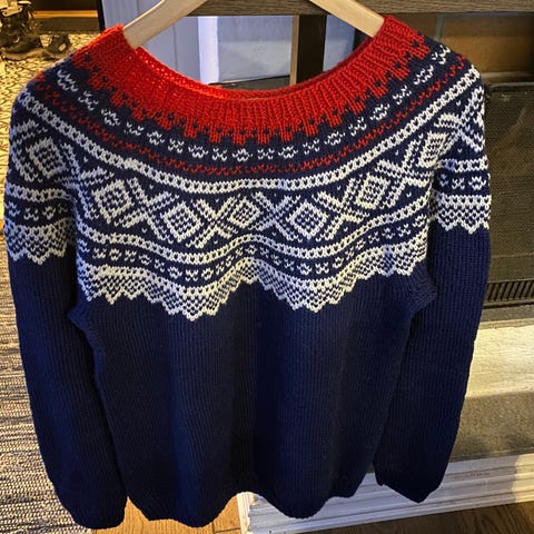 Håndstrikket Mariusgenser i koboltblå ull superwach, overvidde 115 cm, lengde 68 cm, arm 50 cm, selges