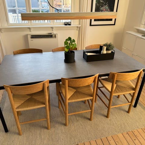 Dette bordet er 100cm bredde og 300cm lengde. Stålben er laget av en lokal smed her i Oslo, men andre alternativer er såklart mulig å lage.
