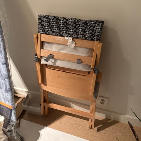 «In the pocket baby» er en sammenleggbar babystol som man kan spenne fast på en vanlig stol dersom man er steder der det mangler et ordentlig sted å sette barnet.