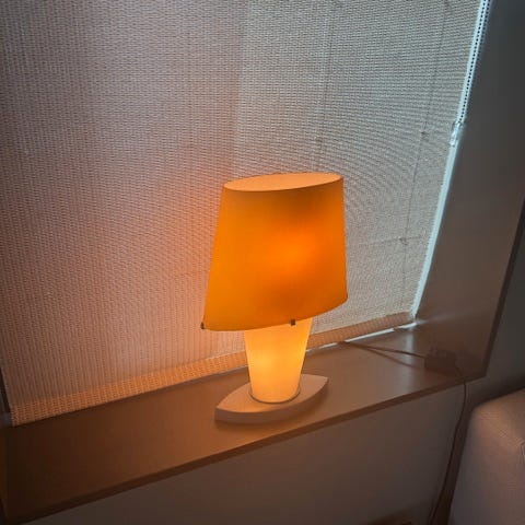 Har dessverre ikke oppheng og skjermen selges derfor meget rimelig. Oppheng fåes kjøpt hos lampeforretninger over hele landet dom selger Flos.