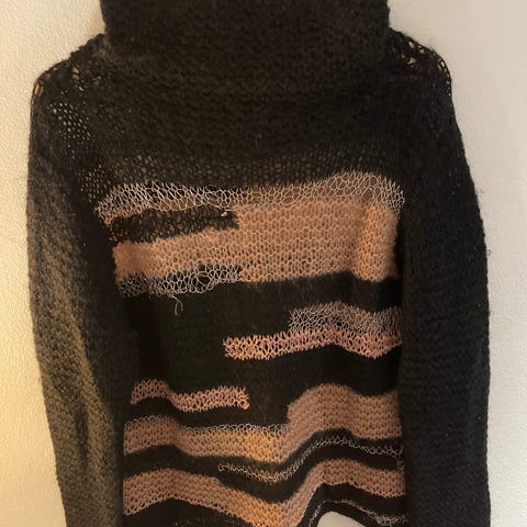 Strikkegenser med høy hals og lange ermer. Løs passform oversized. Denne passer fint både M/L.