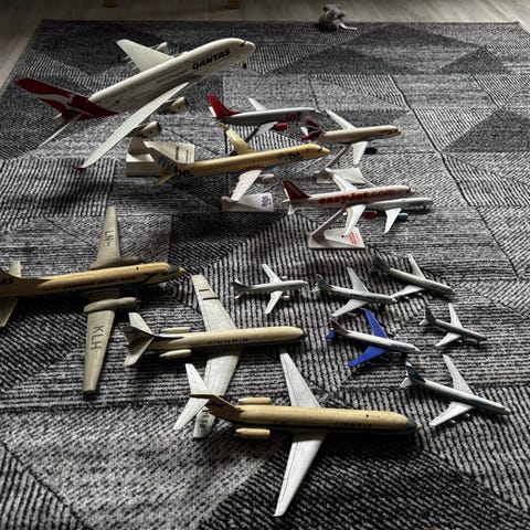 Modellfly i ulike størrelser selges. Noen fly er ødelagt og kommer delvis i deler og noen er litt misfarget. Se bilder.