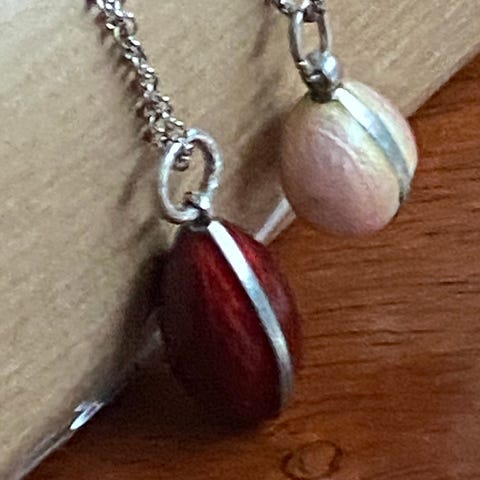 Anheng i form av et egg selges for 250 kr. Sølv, emalje med markasitter. Et par markasitter mangler, men synes lite. - Kan selvfølgelig ordnes hos en gullsmed. Full lengde 2,3 cm. Stemplet for sølv og et ukjent mestermerke. Ikke Faberge, men dekorativt likevel.