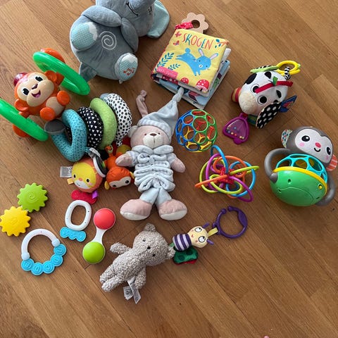 Et drøss med pent og lite brukte babyrangler/leker. Disse er perfekte for babyens første måneder. Bildene tas bort når de er solgt.