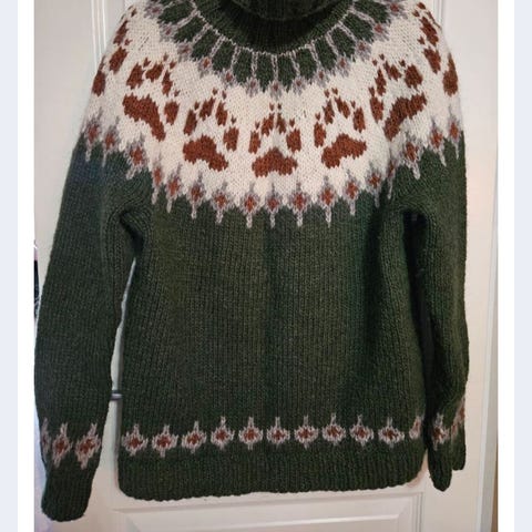 Selger villmarksgenser/potegenser strikket i strl M. Genseren er strikket i det islandske garnet Alafosslopi