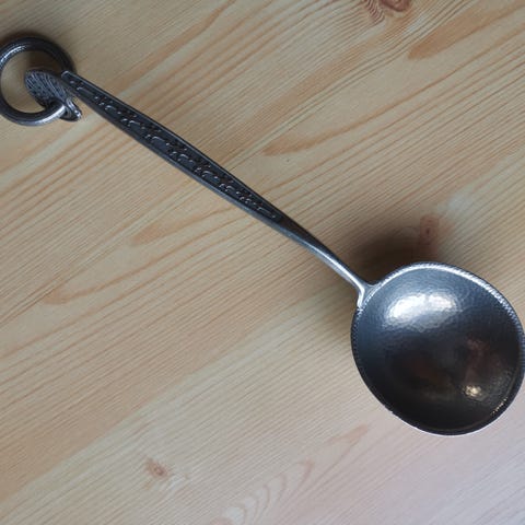 Gammel, stor øse/skje/grøtskje/serveringsskje i støpt tinn.