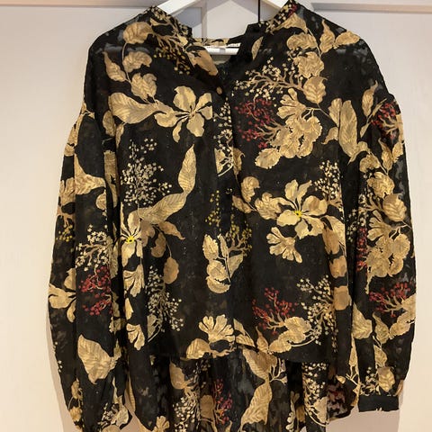 Nydelig bluse i krem/dyp rød farge. Med flott effekt på ermene, med knytebånd.
