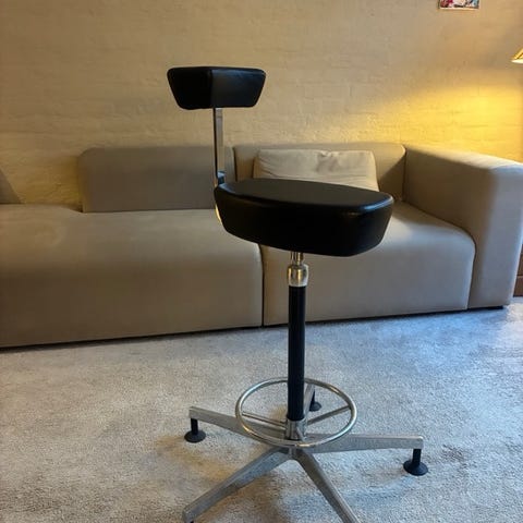 The Nelson Perch (1964) is an ideal solution for a working position somewhere between standing and sitting. It is also useful for people who need to stand up in informal conference situations. Its armrest and ring- shaped footrest allow the user to adopt a comfortable position