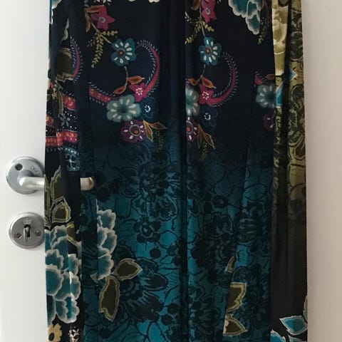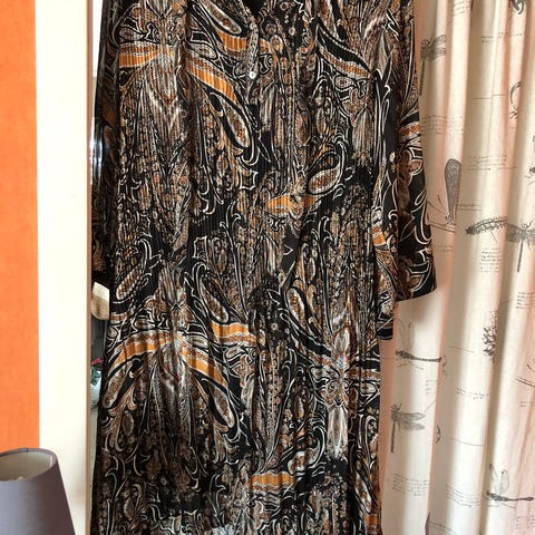 Pen kjole/2delt dress i behagelig stoff med flotte detaljer. Passer til flere anledninger, aldri brukt, kjøpt i Paris, farge svart på skjørt, overdelen svart og gull-grønn - sitron farge. Skjørt er furet, en del av ovetdeo også