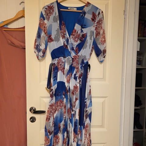 Pen 2 delt kjole med mange detaljer, mørk marine farge med blomster, gull dekor str.. L-XL, strykk i livet
