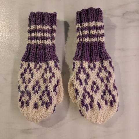 Hjemmestrikkede votter hvite og lilla