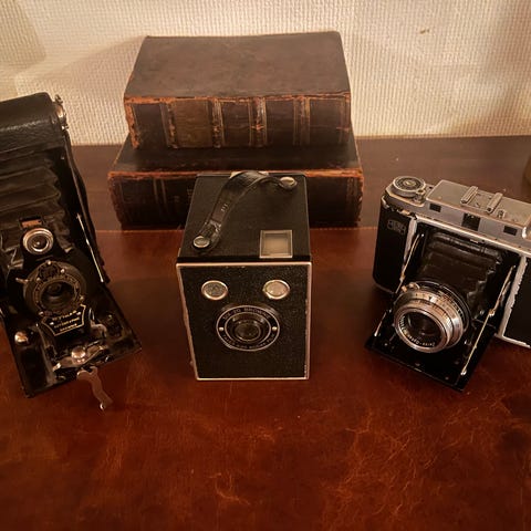 Selger tre stk vintage kameraer. To stk Kodak Brownie Six-20 og et Agfa Syncro box. Vil si alle tre er i god stand, med tanke på alder. Mulig jeg har skinnetui til et eller flere liggende en plass.