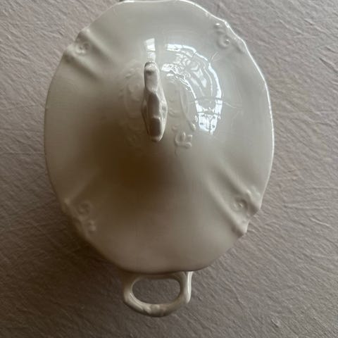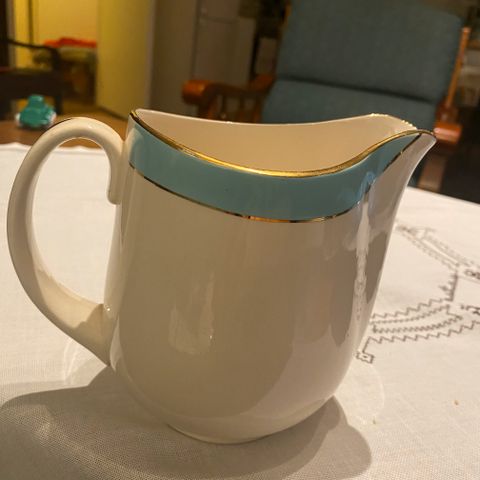 Litt misfarging på lokket, et lite nag under lokket og på den blå kanten ( se bilder)