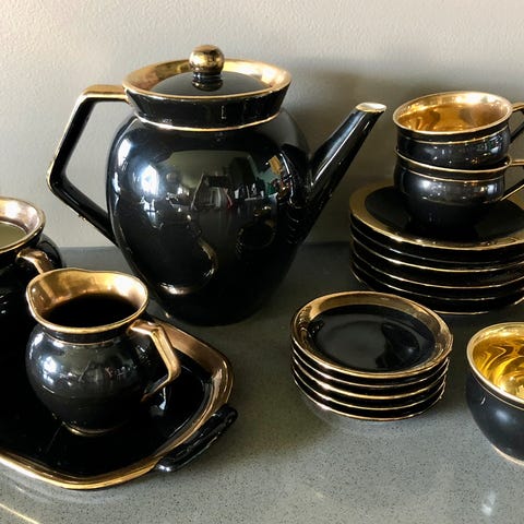 Kanne med lokk, 21 cm høy, med 6 kopper og skåler. Gullkantet med vakre blomsterdetaljer.