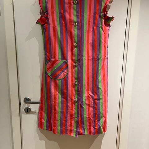 Veldig fin kjole fra Amichi (spanske merke), retro nostalgisk stil, str M som tilsvarer en norsk S eller liten M. Kjolen har to lommer i sidene. 3/4 ermer som har knapp for å gjøre dem kortere. Lengde 81 cm, bredde under armhulene 49. Myk stoff, ligner glatt bomull men det er viskos. Pent brukt, god tilstand.