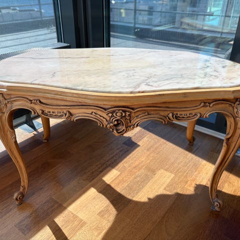 Bordplaten er mørkbeiset i senere tid med et par, små riper i lakken. Kraftige ben sammenføyd med en svungen X-sprosse. Gir assosiasjoner til fransk landstil.