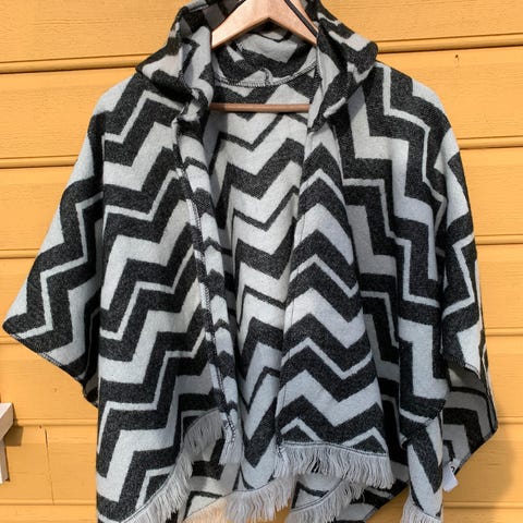 Poncho med hette, fra Only. Størrelse xs. To små lommer med pynteknapp i front. Splitt i sidene.