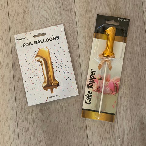 Stor folieballong (100 cm) gull «2» og bursdagslys «1» fra Meri Meri.