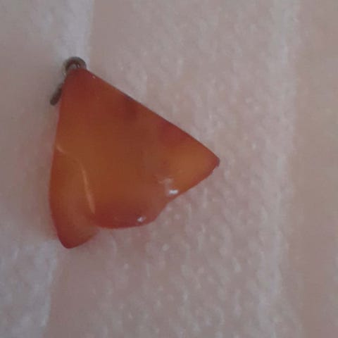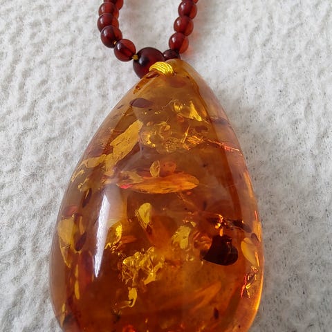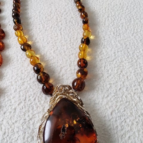 Ravkjedet består av jordbrun skinnrem, og en stor & flott ravsten.