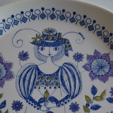 Asjett/skål 18x18 cm H: 3 cm i serien «Pastoraali». Design Esteri Tomula for Arabia made in Finland. I fin stand uten skår/krakeleringer. Friske farger og blank glasur. Asjetten har tre merker på baksiden (se bilde 3) fra produksjonen, les gjerne om støttemerker/spur marks, ved brenning av porselen. Den er merket G 17,5 i selve glasuren, se siste bildet.