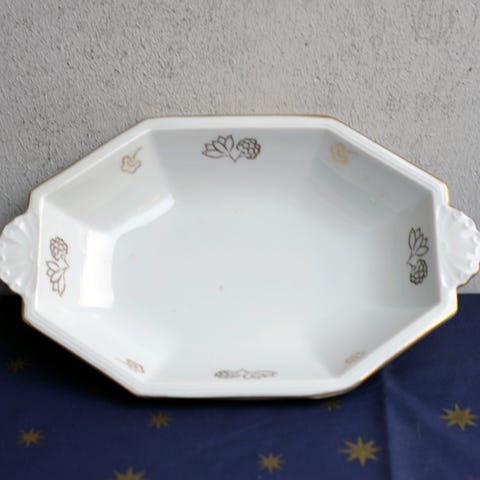Med gulldekor. Str med lokk :h12,5/l27 cm med håndtak. Str selve skålen h7/l22