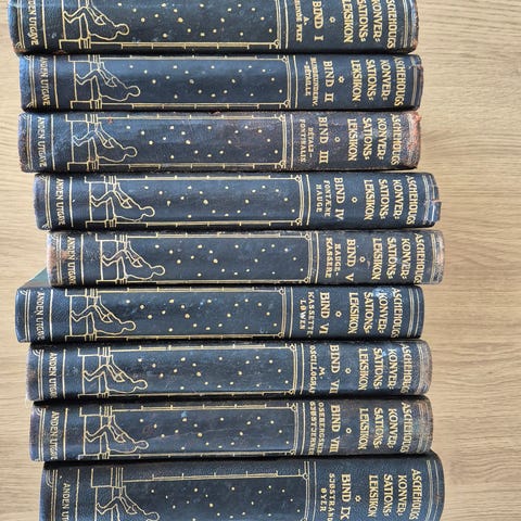 Aschehougs Konversations Leksikon Bind I-IX 1920-25 med Supplementsbind 1932.