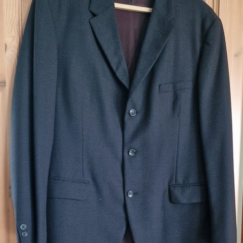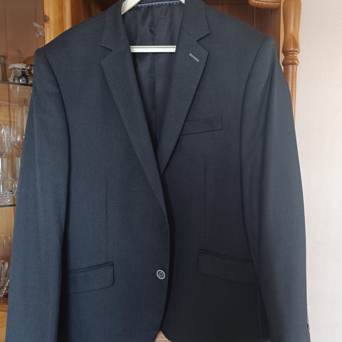 Selger brukt 1 gang mørk grå fôret dressjakke/blazer i klassisk snitt med 3 knapper fra Lelija for 160 kr.