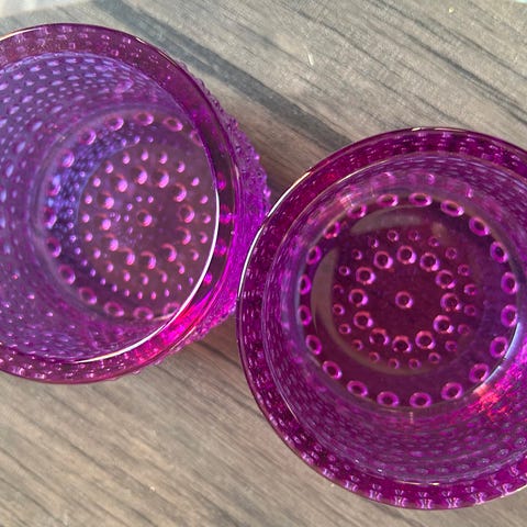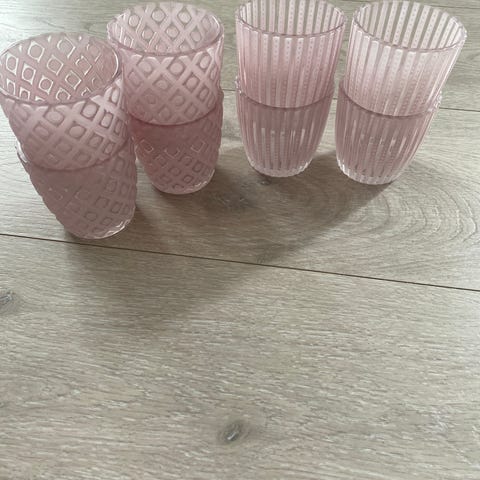 11 like knall rosa telysholdere. De er i metall. Lett å stable når man ikke skal bruke dem.
