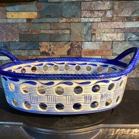 Kurvens lengde med hank ca. 27 cm. Bredde 16 cm. Max høyde 13 cm.