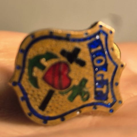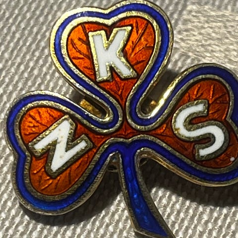 Flott smykke i sølv og emalje av merket David Andersen. Et trekløver med NKS logo.(norske kvinners sanitetsforening). Ingen skader på emaljen.