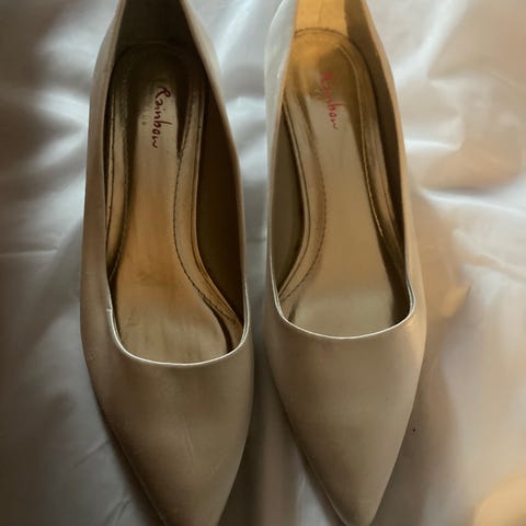 Skoene er brukt en dag og har noen bruksmerker. Kun forsiktig vasket med klut og sitronsåpe for å unngå å skade satengstoffet, mulig merkene lar seg fjerne med litt mer grundig vask.