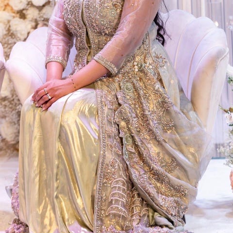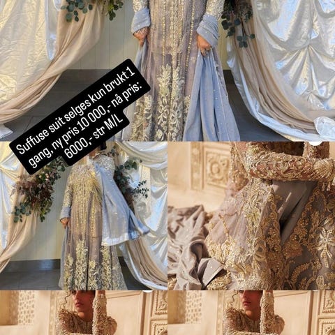 Kjolen er håndsydd og inneholder mange perler! Den kommer med 2 deler: Underdelen har ikke ermer slik at man ikke blir så varm. Og overdelen har en lang splitt foran. Den er lang bak med mange fine detaljer. Strl er L men en M ville nok passet.