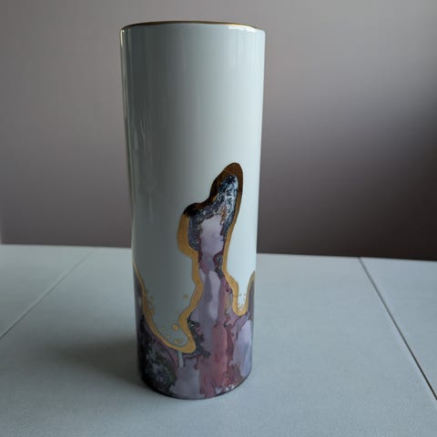 Kjempekul blomstervase med detaljer i pastellfarger og bølger øverst.