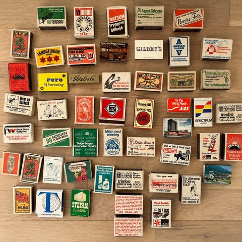 Fyrstikkesker fra hovedsakelig Norge. Noen fulle. Noen halve og noen tomme. Selges samlet.