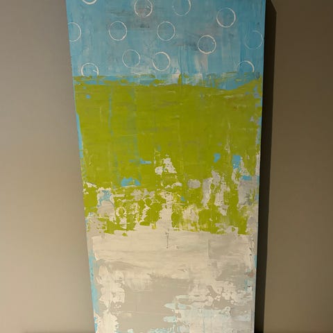 Delikate farger i maleriet som måler 29×88 cm. Malerinnen er svensk og maleriet ble kjøpt på Lauritz.com i sin tid - nå trenger det et nytt hjem....