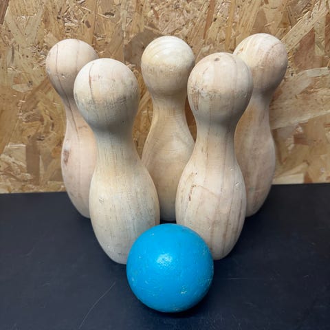 Bowling sett mini laget av plast i fargene hvit og rød. Settet består av små kjegler er 2 cm høye spesielt for barn eller som en morsom aktivitet ved sammenkomster. Fulgt med i et tegneserieblad. Sender også som brevpost.