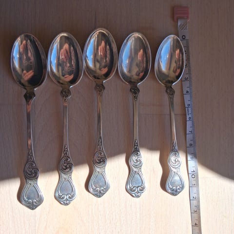 Det er kun de 4 store spiseskjeene + en spiseskje, og to teskjeer som har eierinitialer, og kanskje noen datoer.